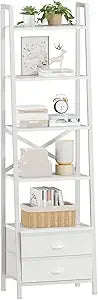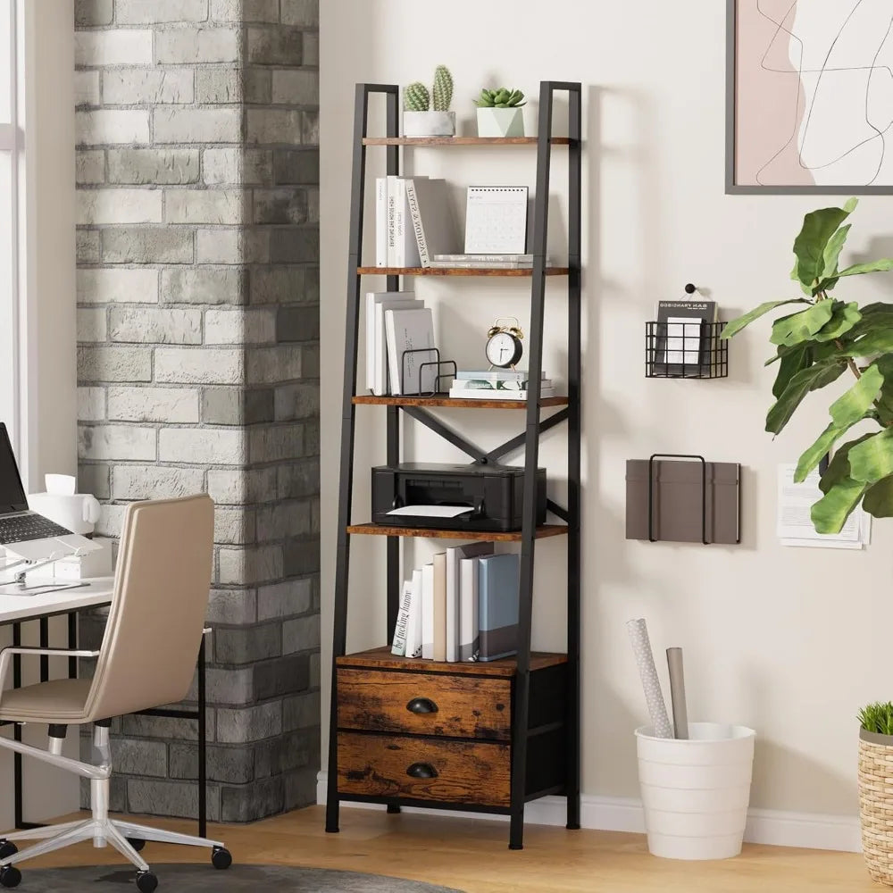 5-Tier Ladder Shelf with 2 Drawers,Narrow Bookshelf Storage Shelves,Industrial Bookcase Freestanding Rack Units for Bedroom,Liv