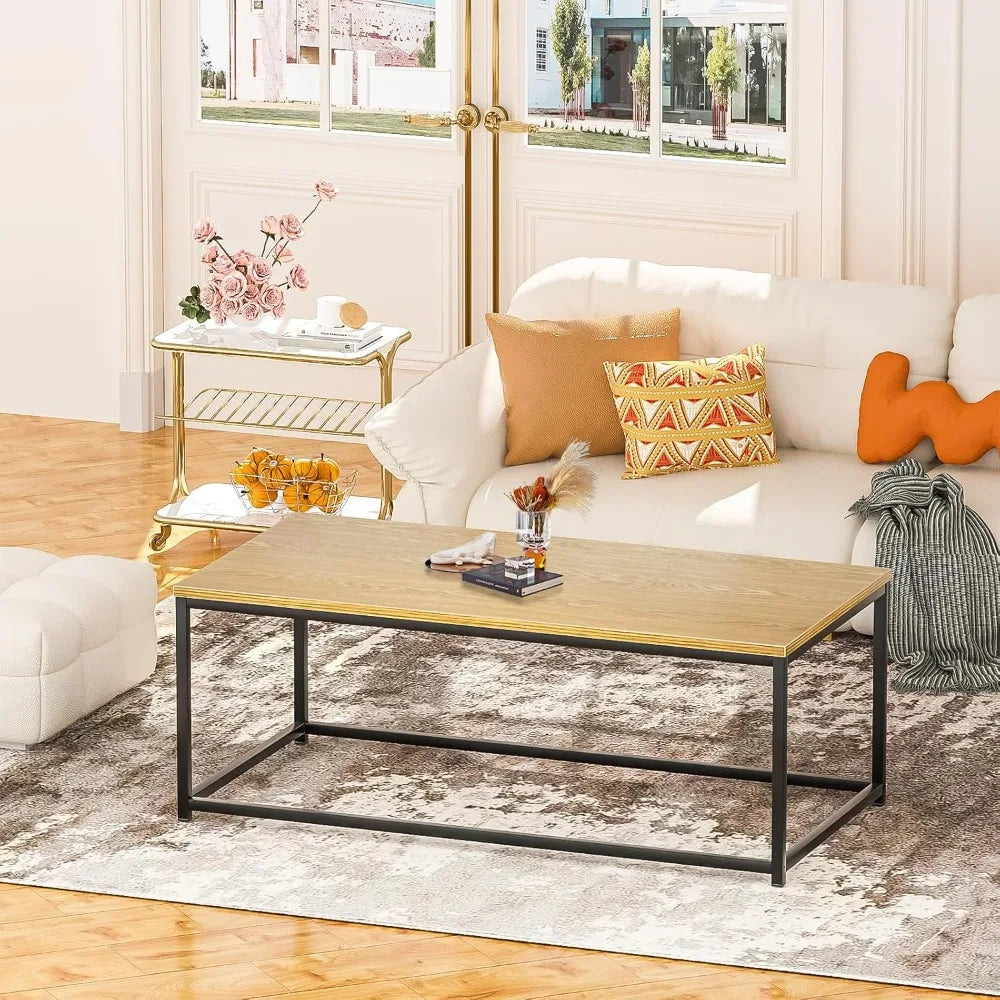 Modern Industrial Style Rectangular Coffee Table for Living Room, Bedroom - Rustic Accent Minimalistic Furniture with Wood Grain