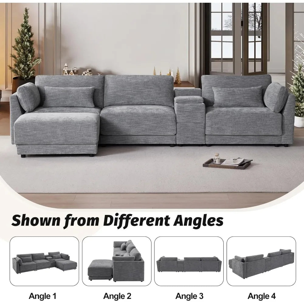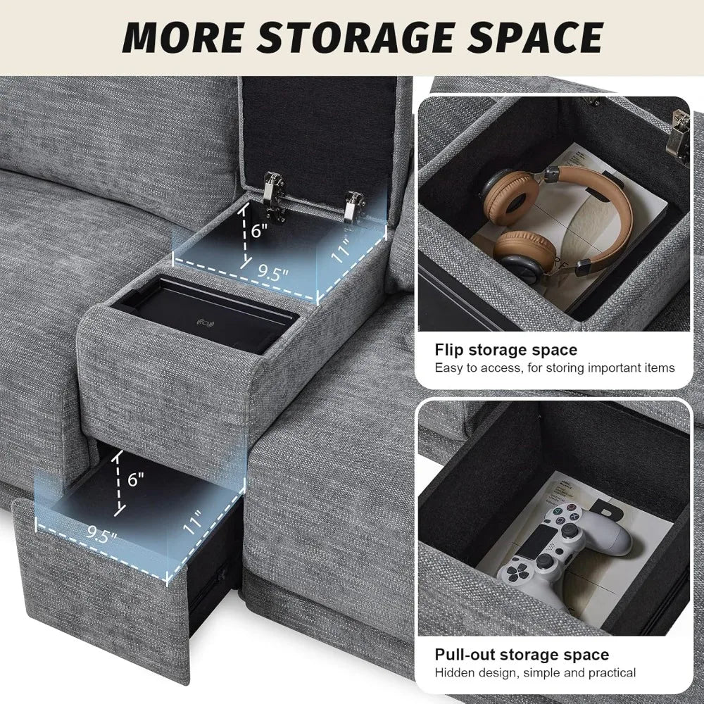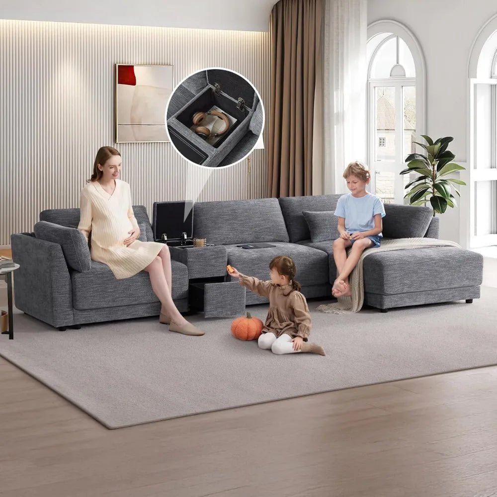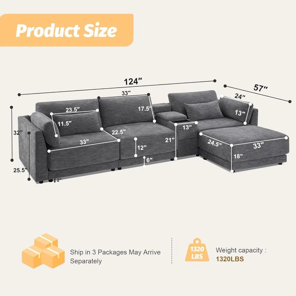 124" Modular L-Shaped Sectional Sofa with Storage Console, Movable Ottoman & USB/Wireless Charging - 33" Wide Seats