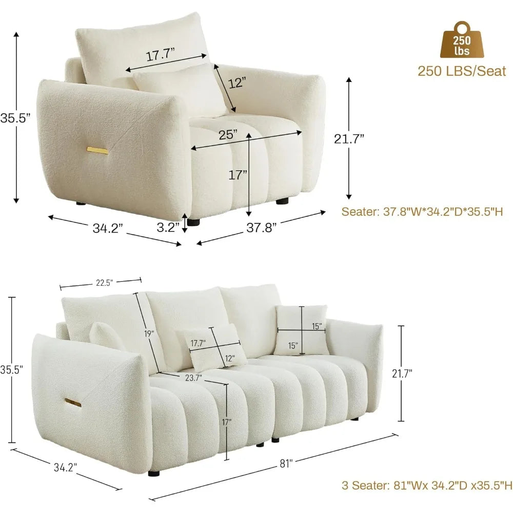 2 Piece Teddy Cloud Sofa Couch Set, Modern Deep Seat 3 Seater Boucle Sofa & Single Sofa Chair, Cozy Upholstered Sherpa Living