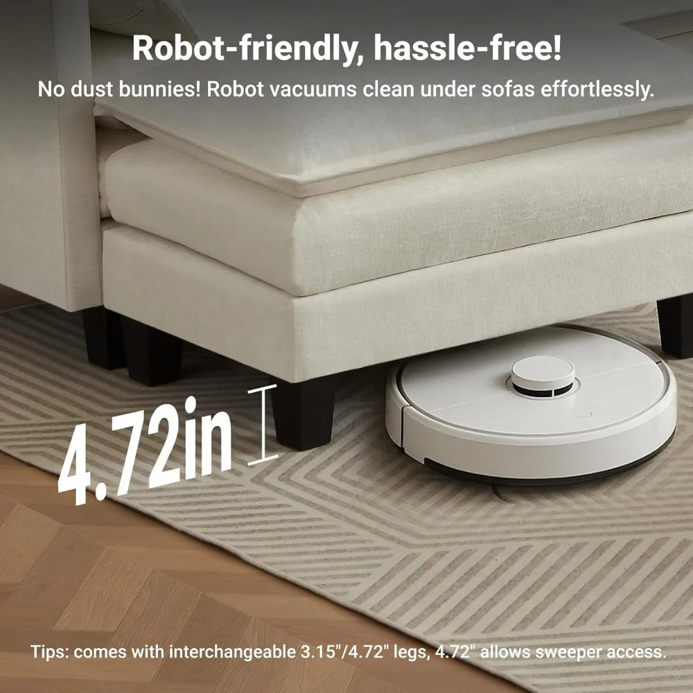 - Two Sets of Sofa Legs: This cloud sofa comes with two sets of interchangeable legs: a 3.15-inch (8cm) set and a 4.72-inch (12cm) set, allowing you to customize the height to fit your comfort level and needs. Whether you prefer a lower, lounge-style feel or a higher seat for easy access, this thoughtful design adapts to you. Plus, the 4.72-inch (12cm) height provides enough clearance for a robotic vacuum, making cleaning underneath effortless.